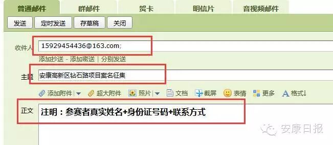 网络参与方法:在规定时间内,将案名及相关注释等以文档形象发送至高新区钻石路项目公众邮箱: 15929454436@163.com ,请在主题栏写明 “安康高新区钻石路项目案名征集”,并文档注明参赛者真实姓名、身份证号码、联系方式。