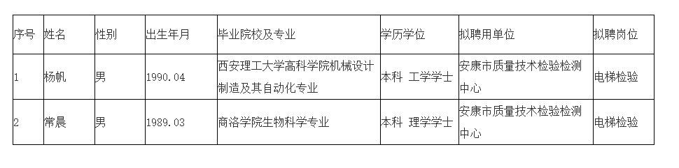 附件:安康市质量技术监督局2018年公开招聘紧缺特殊人才拟聘用人员汇总表