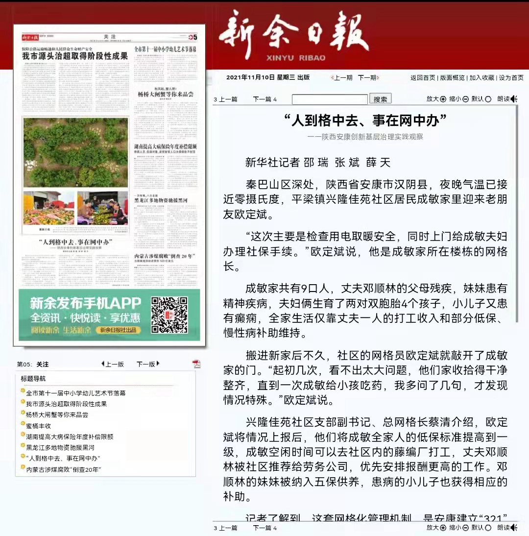 本网讯(实习记者 赵漪湉)11月8日,新华社刊发记者邵瑞、张斌、薛天采写的稿件《“人到格中去、事在网中办”——陕西安康创新基层治理实践观察》,聚焦我市创新建立的“321”基层治理模式。zun安康新闻网
