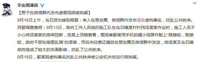 9月19日,湘潭县警方通过官方微博表示,9月16日上午,乌石派出接到报警电话:有人在朋友圈、微信群内发布谣言,扰乱公共秩序。民警调查查明:9月13日,政府工作人员组织施工队在乌石镇村民汤某家作业时,施工人员不小心将汤某家的房梁挖断。随后,汤某上顶楼查看,围观者鄢某用手机拍摄小视频并配上“跳楼哒,跳楼哒,政府干部在这里乱搞”的语音,在未经查证的情况下,擅自发送至朋友圈以及微信群中,给汤某及乌石镇政府造成了较大的负面影响。
