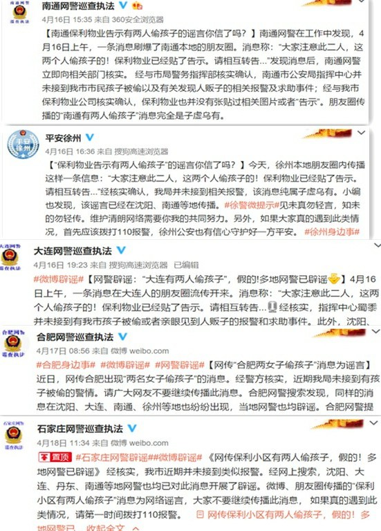 4月16日至18日,又有南通、徐州、大连、合肥、石家庄等地热传同样的“两女子偷孩子”照片,当地警方均对此辟谣。