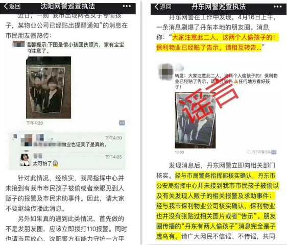 该则消息在沈阳的网民朋友圈中打着“温馨提示”的名号,声称“下图是偷小孩团伙照片,家要有宝宝的注意了”。丹东流传的版本则为“大家注意此二人,这两个人偷孩子的!保利物业已经贴了告示。请相互转告...”