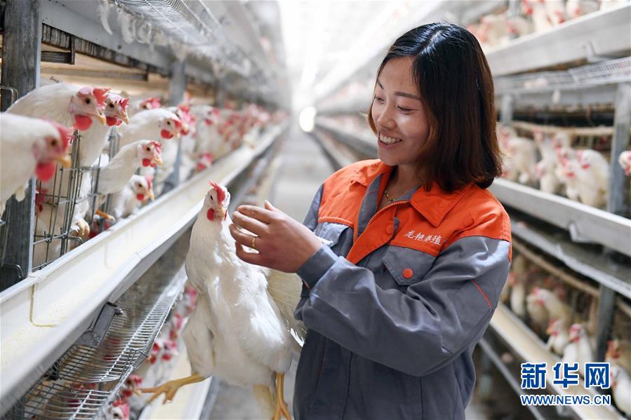 云南省镇雄县五德镇渡船坝社区农家女刘艳外出务工多年后返乡创业,带动乡亲们发展山地生态鸡和优质蛋鸡养殖增收脱贫。这是刘艳在养殖场查看优质蛋鸡(6月4日摄)。新华社记者 杨宗友 摄