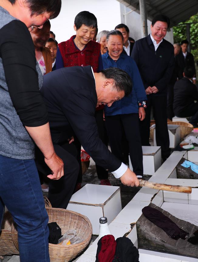 2018年4月24日下午,习近平在宜昌市许家冲村考察时,在便民洗衣池边用棒槌试着捶打衣服。新华社记者 谢环驰 摄