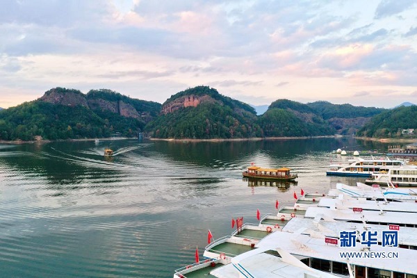 游船驶向福建省泰宁县大金湖畔的梅口乡水际村游客码头(11月19日摄,无人机照片)。新华社记者 姜克红 摄