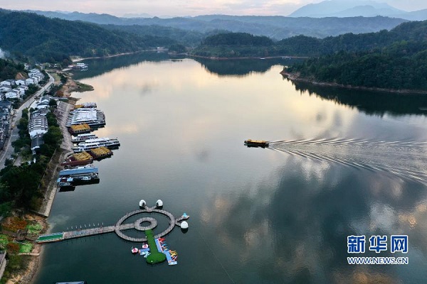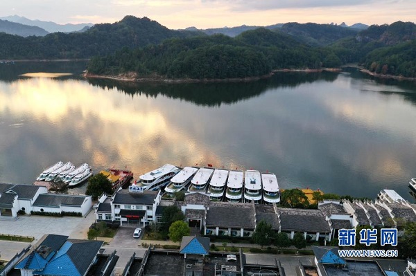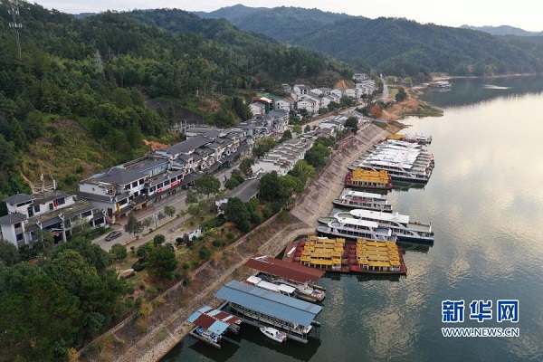 福建省泰宁县大金湖畔的梅口乡水际村及游客码头(11月19日摄,无人机照片)。新华社记者 姜克红 摄