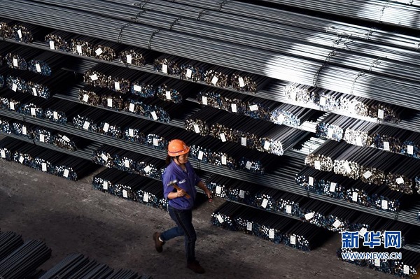 11月17日,福建省三明市三钢集团的工人走过成品堆放区。新华社记者 姜克红 摄