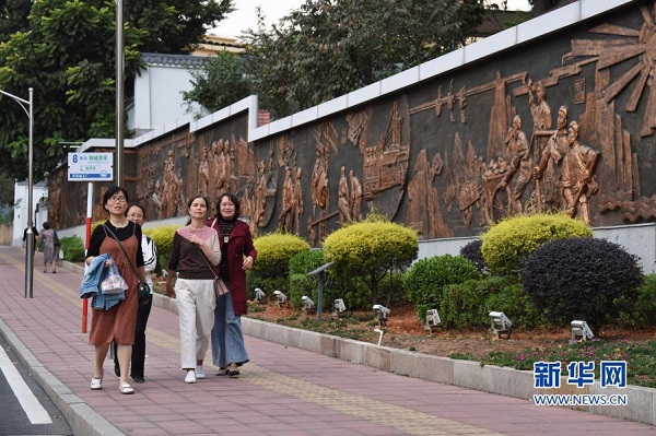 11月17日,行人在福建省三明市三钢集团生活区走过浮雕墙。新华社记者 姜克红 摄