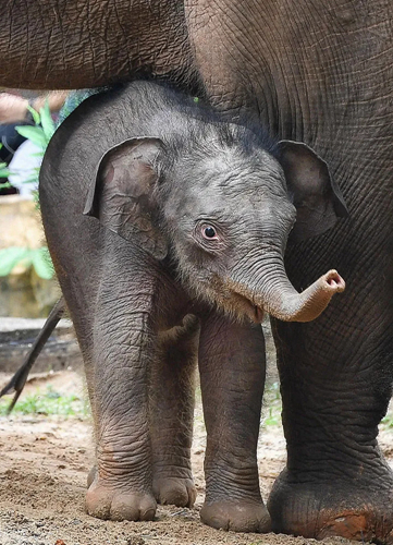 2020年5月27日,广州长隆野生动物世界的新生亚洲象宝宝在妈妈身边玩耍。新华社记者 刘大伟 摄