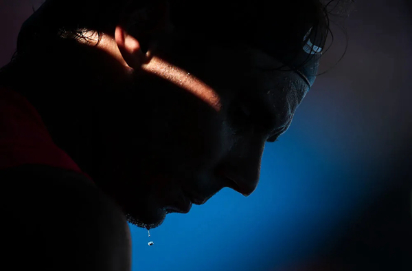 2020年1月25日,西班牙选手纳达尔在澳大利亚墨尔本举行的澳大利亚网球公开赛男子单打第三轮比赛中汗如雨下。新华社记者 白雪飞 摄