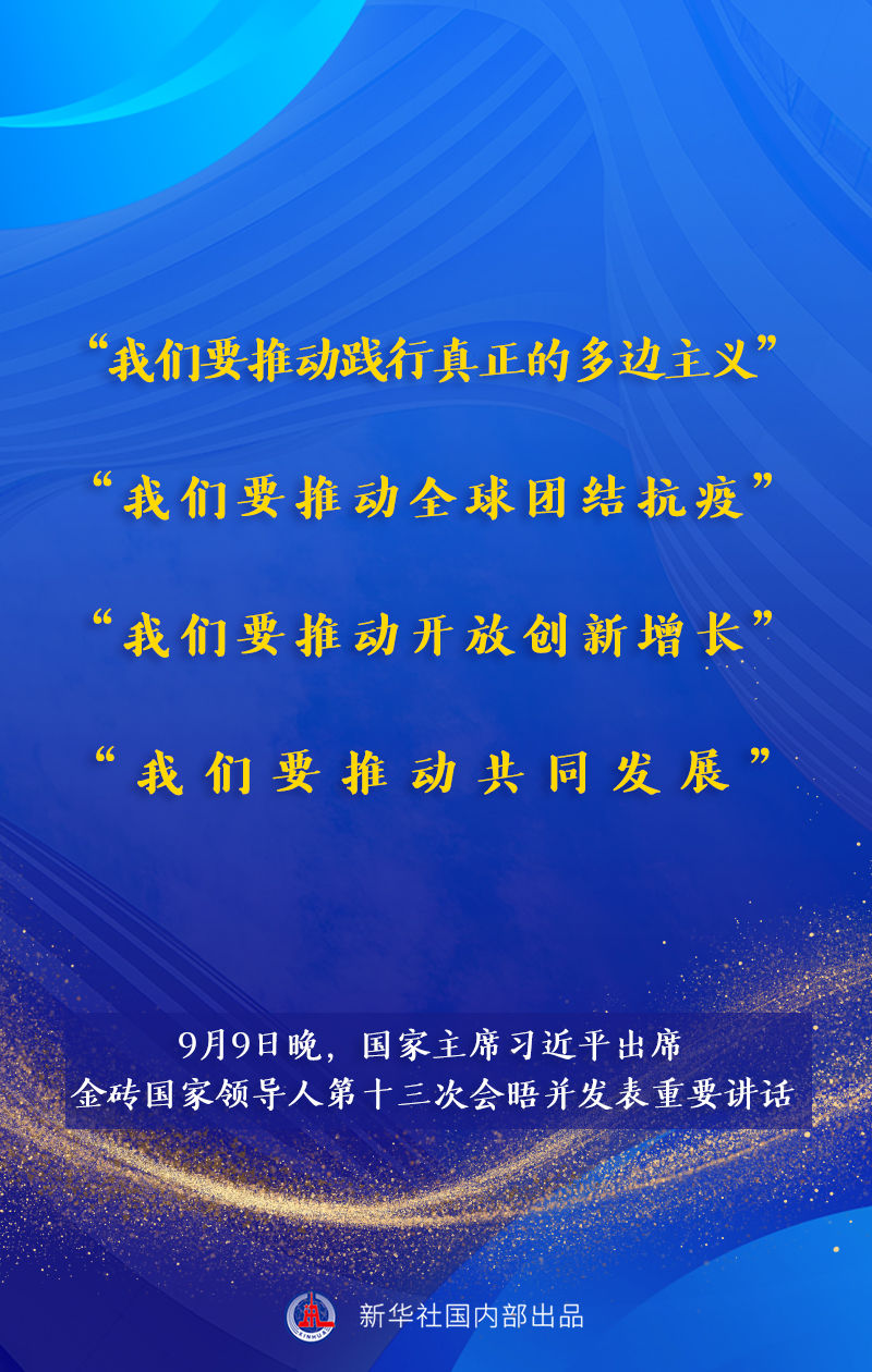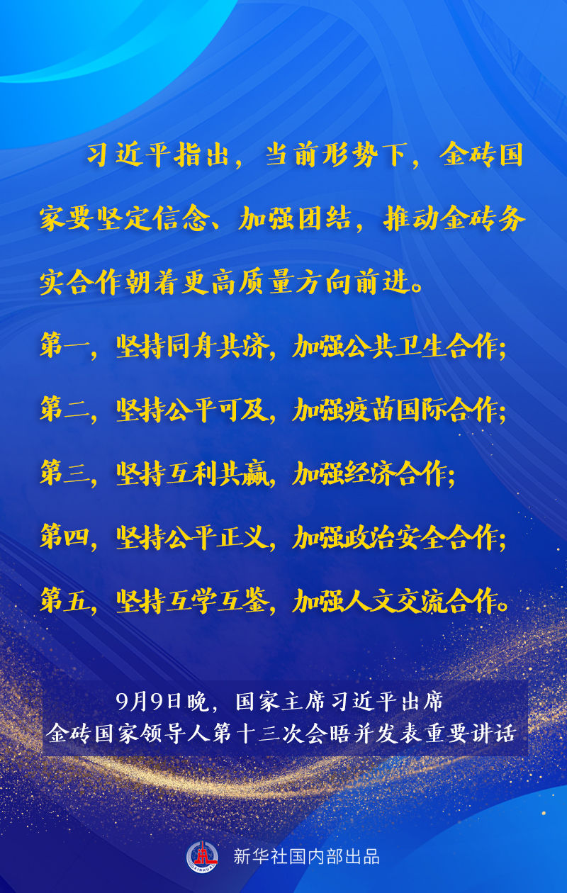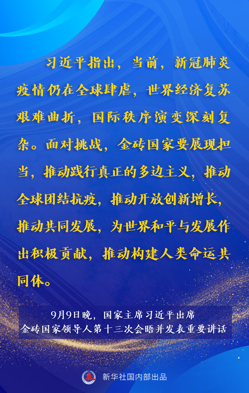金砖国家领导人第十三次会晤9日晚以视频方式举行。国家主席习近平出席会晤并发表题为《携手金砖合作 应对共同挑战》的重要讲话。讲话有哪些主要内容,一起来看。