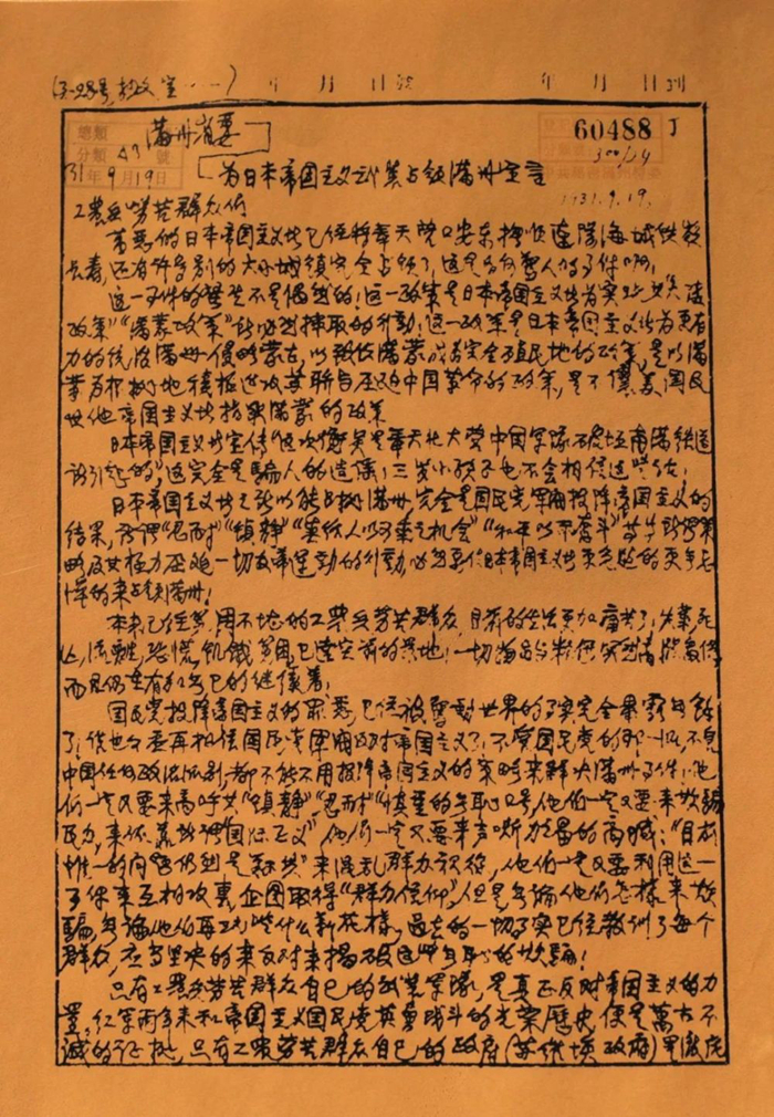 《中共满洲省委为日本帝国主义武装占领满洲宣言》