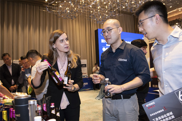 在深圳举行的进博会展前供需对接活动上,波兰投资贸易局的工作人员(左前)向采购商展示风味啤酒(2023年8月29日摄)。新华社记者 毛思倩 摄
