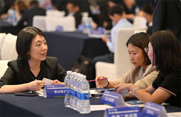 在第六届中国国际进口博览会招商路演(天津)活动现场,参展商代表和天津的采购商代表进行交流(2023年9月26日摄)。新华社记者 李然 摄