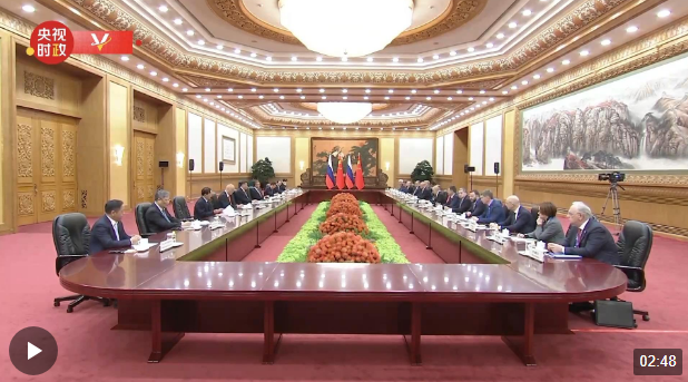 10月18日上午,国家主席习近平在人民大会堂同来华出席第三届“一带一路”国际合作高峰论坛的俄罗斯总统普京会谈。