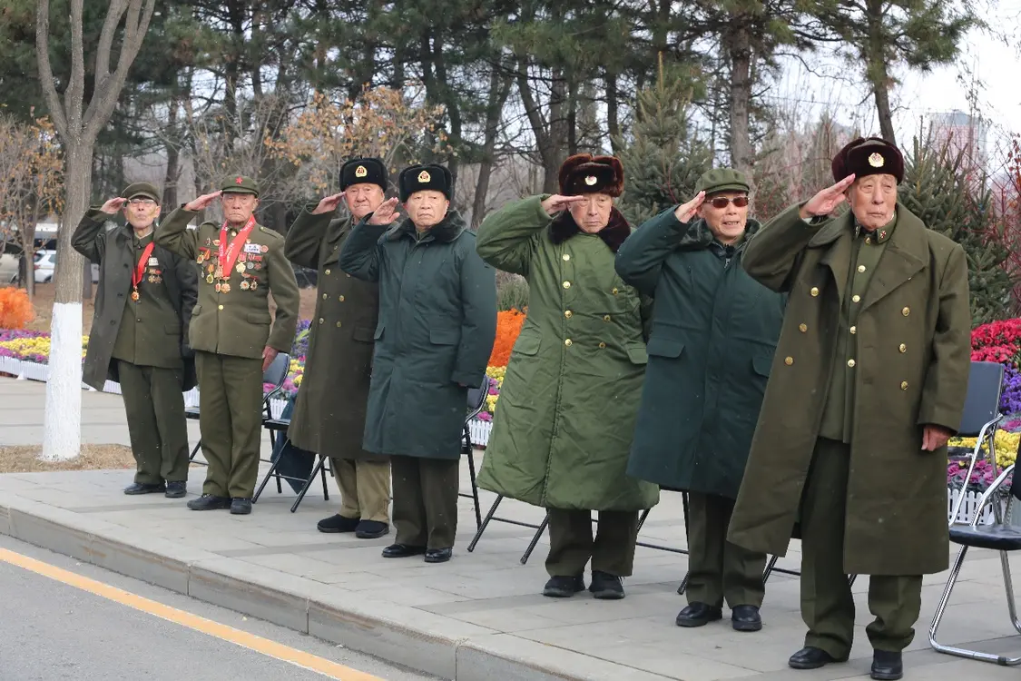 当护送志愿军烈士遗骸棺椁的骑警车队即将抵达沈阳抗美援朝烈士陵园时,几位已过耄耋之年的志愿军老战士颤颤巍巍地从凳子上起身。他们举起右手,一齐向迎面驶来的车队敬礼。