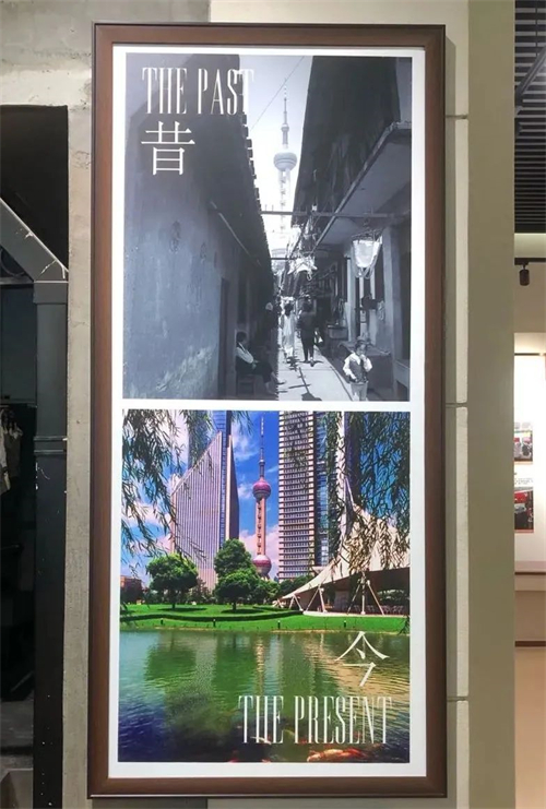 △展厅内,同一视角上海今昔对比图。上面一张“烂泥渡路”照片,拍摄于1995年左右,下面一张照片则摄于近年,满目高楼林立、绿草如茵。