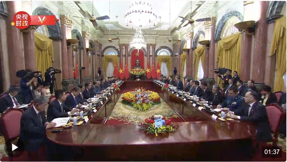 当地时间12月13日上午,中共中央总书记、国家主席习近平在河内主席府同越南国家主席武文赏举行会谈。