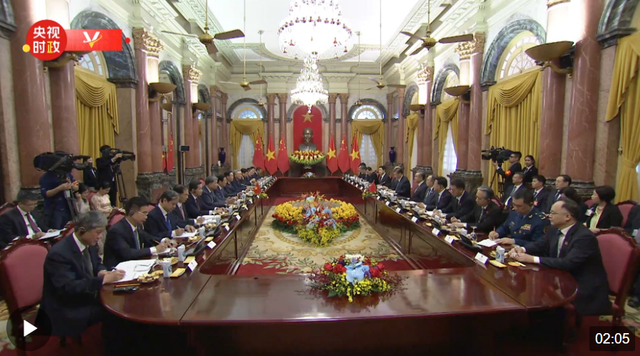 当地时间12月13日上午,中共中央总书记、国家主席习近平在河内主席府同越南国家主席武文赏举行会谈。