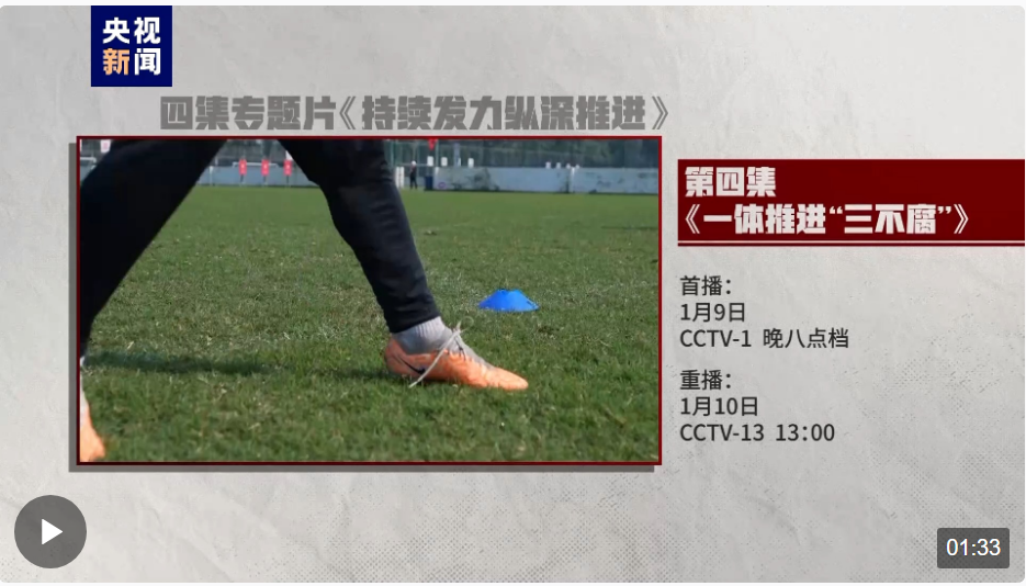 央视综合频道今晚8点档播出电视专题片《持续发力纵深推进》第四集《一体推进“三不腐”》,通过国家体育总局原副局长、中国足球协会原党委书记杜兆才、中国足球协会原主席陈戌源、中国国家男子足球队原主教练李铁等足球领域系列腐败案,人民银行原党委委员、副行长范一飞案,国家能源投资集团原党组成员、副总经理李东案,讲述我们党始终以最彻底的自我革命精神反腐败,紧盯重点问题、重点领域、重点对象,以零容忍态度反腐惩恶,一体推进不敢腐、不能腐、不想腐,坚决打赢反腐败斗争攻坚战持久战。