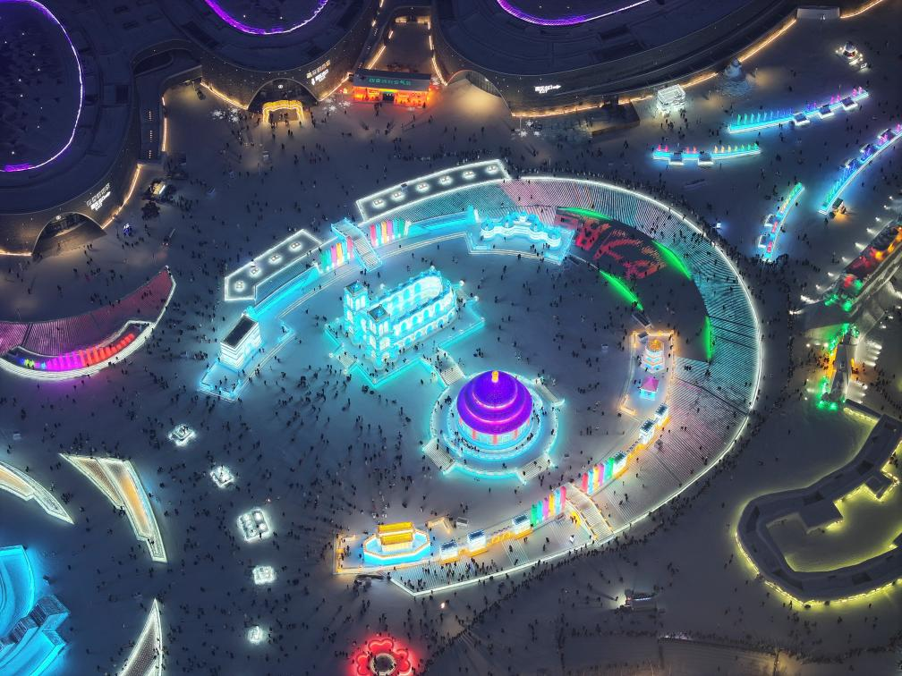 这是2023年12月27日在哈尔滨冰雪大世界拍摄的以巴黎圣母院和北京天坛为核心的冰建景观群。