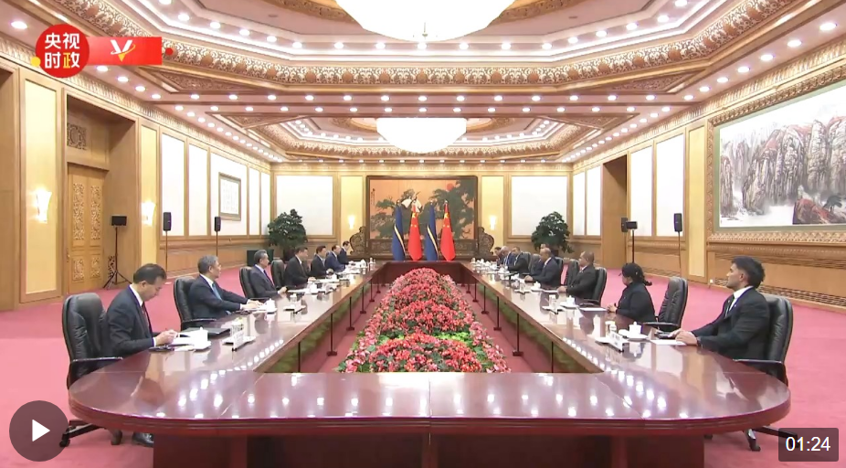 习近平说,欢迎你对中国进行国事访问。今年1月,瑙鲁作出坚持一个中国原则、同中国复交的政治决断。这是符合历史大势、顺应时代潮流之举。我们是第一次见面,但我对太平洋岛国并不陌生,曾3次到访过这个地区。我们在南太有很多老朋友,现在又有了你这位新朋友,我感到很高兴。