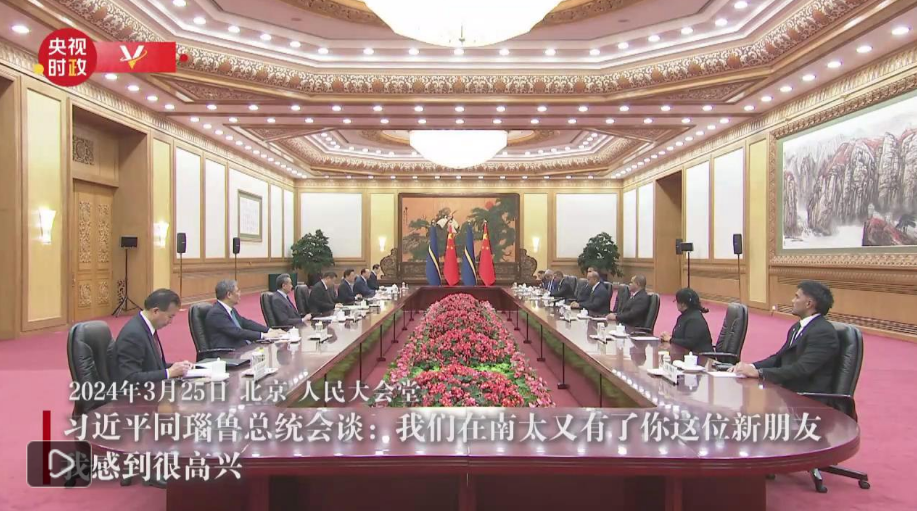3月25日,北京人民大会堂,中国国家主席习近平同来华进行国事访问的瑙鲁总统阿迪昂举行会谈。两位元首的会面,话题从北京的仲春时节说起。