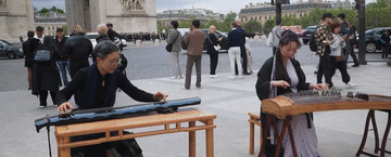 凯旋门下,神奇的一幕发生了,中国艺术家和法国军乐队同框演奏,巴黎街头同时回荡着中法两国的音乐声。
