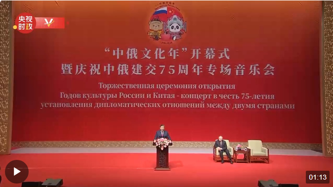 5月16日下午,国家主席习近平和俄罗斯总统普京在北京国家大剧院共同出席“中俄文化年”开幕式暨庆祝中俄建交75周年专场音乐会并致辞。