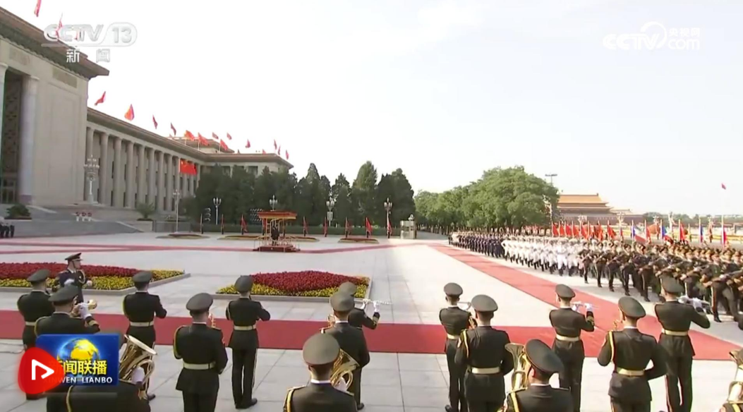 会谈前,习近平和夫人彭丽媛在人民大会堂东门外广场为奥比昂和夫人康斯坦西娅举行欢迎仪式。