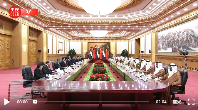 5月30日下午,国家主席习近平在北京人民大会堂同来华国事访问并出席中国—阿拉伯国家合作论坛第十届部长级会议开幕式的阿联酋总统穆罕默德举行会谈。