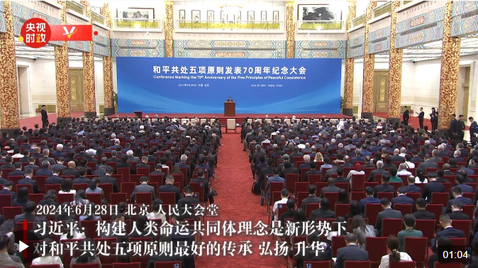 6月28日上午,和平共处五项原则发表70周年纪念大会在北京人民大会堂隆重举行。国家主席习近平出席纪念大会并发表题为《弘扬和平共处五项原则,携手构建人类命运共同体》的重要讲话。