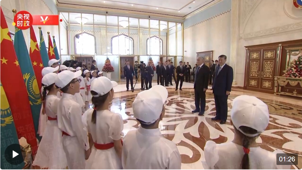 在托卡耶夫总统陪同下,习近平主席欣赏哈萨克斯坦少年儿童用中文演唱《歌唱祖国》。SbX安康新闻网