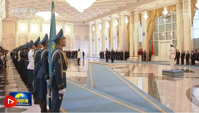 总统府大厅气势恢宏,礼兵威武挺拔。两国元首分别同对方陪同人员一一握手致意。两国元首登上检阅台,军乐团奏中哈两国国歌。习近平在托卡耶夫陪同下检阅仪仗队。