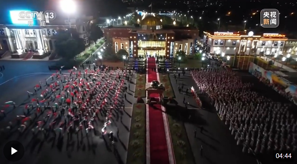 1500多名身着民族盛装的塔吉克斯坦青年表演富有浓郁特色的中塔歌舞,挥舞中塔两国国旗,表达对中国最尊贵客人的热烈欢迎。