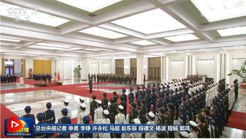 天安门广场鸣放21响礼炮,礼兵列队致敬。两国元首登上检阅台,军乐团奏中马两国国歌。易卜拉欣在习近平陪同下检阅中国人民解放军仪仗队,并观看分列式。