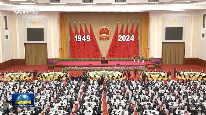 人民大会堂宴会厅华灯璀璨,洋溢着喜庆热烈的节日氛围。主席台上方高悬着庄严的国徽,“1949-2024”大字年号在鲜艳红旗映衬下格外醒目。