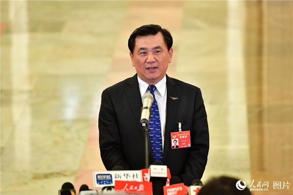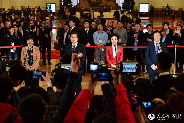 全国政协十三届二次会议首场委员通道于3月3日14:00在人民大会堂一层中央大厅北侧举行。9位全国政协委员接受记者采访。人民网记者 于凯 摄……
