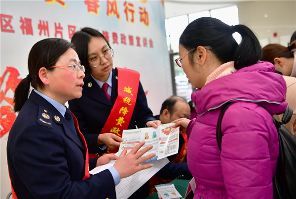 国家税务总局福州经济技术开发区税务局工作人员,在马尾区“减税降费 春风行动”宣讲活动现场为一家企业的出纳(右一)讲解税收优惠政策(2月25日摄)。 新华社……