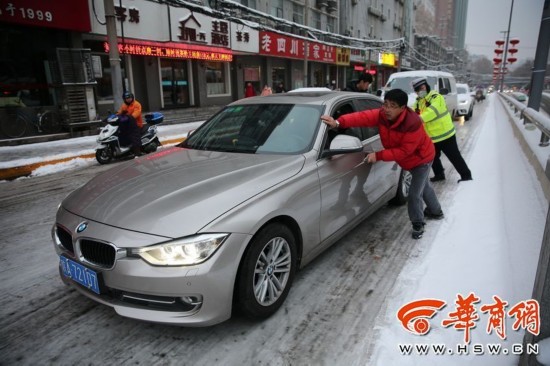 1月4日在西安市咸宁路上,雪后路面太滑,红灯停下后,宝马车打滑都无法起步。 华商记者 邓小卫 摄影报道