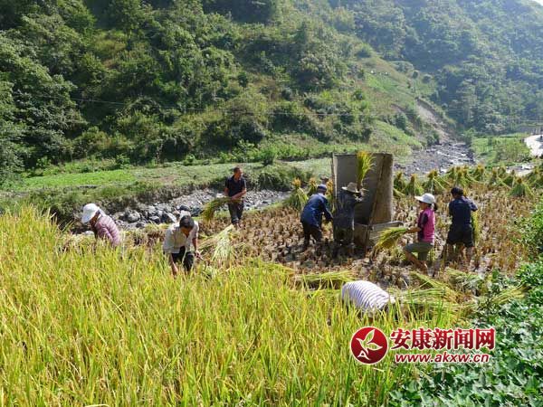 由于今年风调雨顺,加之政府及时发放种植补贴、农业技术跟踪服务指导等多项措施的推动,紫阳县联合镇千亩米粮川道栽种的水稻获得丰收。gXB安康新闻网