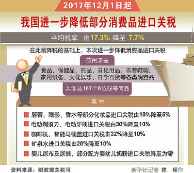 其实2015年以来,我国已连续多次降低消费品进口关税,分别是2015年6月、2016年1月和2017年1月,主要选取了我国居民在境外购买意愿较强、关税税率较高的消费品。到2017年11月,我国已对152个税号的消费品实施了暂定税率,平均降幅为50%,涉及一般贸易年进口额109亿美元。