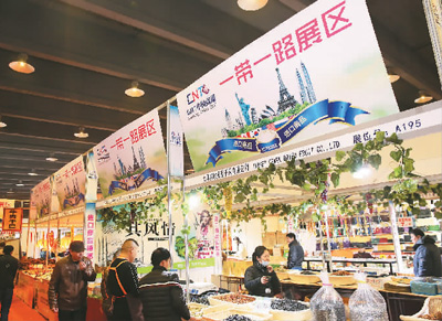 | 2017中国南通进口商品博览会现场,消费者在“一带一路”展区查看商品。 |