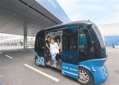 4月21日,中国首款商用级无人驾驶巴士在首届数字中国建设峰会主会场——福州海峡国际会展中心亮相。4月22日至24日峰会举办期间,该巴士面向公众开放试乘体验。图为市民在体验无人驾驶巴士。