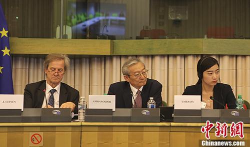 图中为张明,左一为欧洲议会对华关系代表团团长乔·莱恩。 中新社记者 德永健 摄