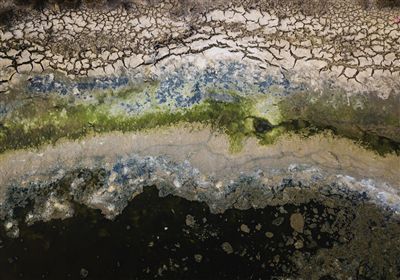 图为2018年3月30日在江苏连云港燕尾港镇化工园区内拍摄的一处水塘,离海一堤之隔的池塘水和岸滩“五颜六色”。记者 李响 摄