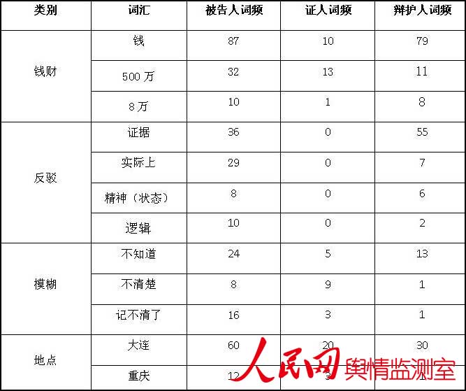 “大连”同时成为被告人、证人、辩护人三者的高频地点词汇,被告人曾任大连市市长,本案又与大连实德集团前总裁徐明、大连国际发展有限公司总经理唐肖林密切相关,辩证双方的辩论围绕地点和产业展开,被告人涉嫌贪污、受贿。2008年以后被告人到重庆工作,其任职期间“薄谷开来投毒杀害尼尔伍德案”和“王立军案”发生,被告人涉嫌滥用职权。