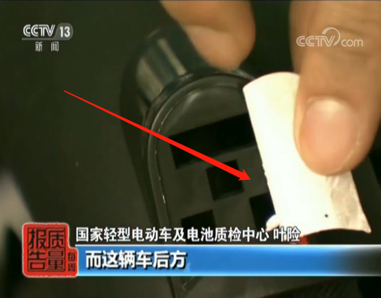 国家轻型电动车及电池质检中心 叶险:我们可以看到这辆车,这辆车是装有后反射器的,所以它可以使得后方的机动车发现它。而这辆车它后方其实是没有反射器的,我们看这个好像是疑似反射器,但它仅仅只是一张贴纸,我们一次就可以把它撕下来,它是起不到任何反射作用。所以这辆车的话,是没有保证它的骑行者的安全的。