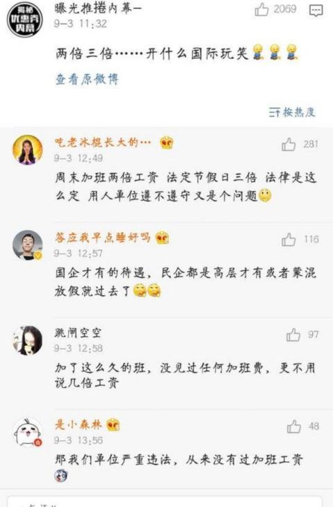 当然,对于节假日给加班工资,网友也有话要说。“我们单位从来没有给过加班工资”“两倍、三倍,开什么国际玩笑?”“法律是这么规定的,用人单位遵不遵守又是个问题。”……看来,加不加班是个问题,能不能得到加班工资更是一个问题。