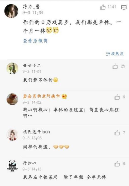 还有网友吐槽,“你们的日历戏真多,我们都是单休”;“平时单休就算了,节假日还得值班”。3日下午两点过,记者在成都IFS采访到职业是医生的杨小姐,她表示节假日一般只放法定休假的那几天,其他时间要值班,今年两个假期只休4天,轮休的话可以多两天。“我老家在内江,放假打算回家陪陪家人,顺便参加一场婚礼。”